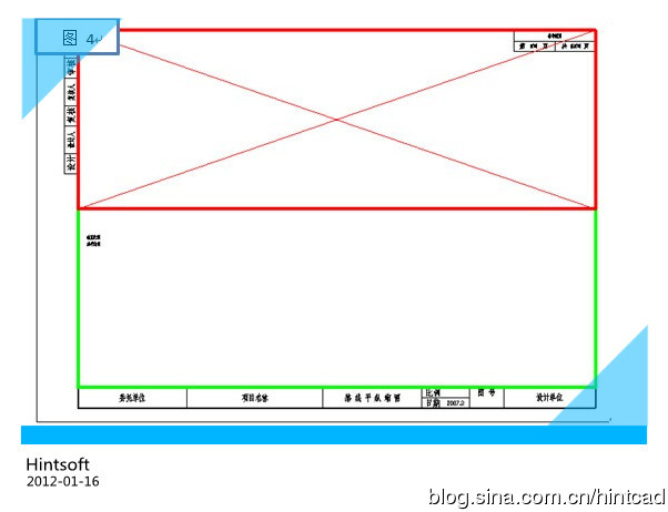 下面,解释一下,如上操作每一步的作用,框选图框后,系统会提示我们分别输入绘图范围的左下角和右上角(即选择如图4中绿色矩形框辅助线区域),该区域是纵断面相关图及图例绘图区域,该矩形框的区域的长度将直接决定我们平纵缩图中,每幅图中每页中包含多长。纵断面绘图区域指定好后,系统提示我们输入图框插入点,这时候我们点选的下图红色区域(平面图绘制区域),我们先选的位置即为该幅图中红色区域中心,平面的中心。随后我们在布局空间建立与红色辅助线同位置同大小的视口来控制平面图的出图范围。
