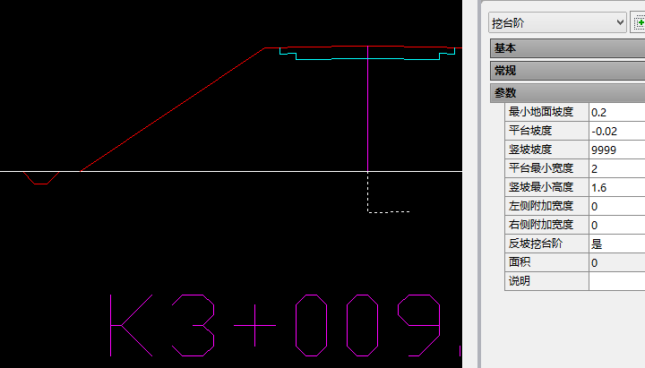 2、挖台阶平台坡度,若为向内侧倾斜时,则输入负值,例如向内侧倾斜“2%”,则输入“-0.02”;