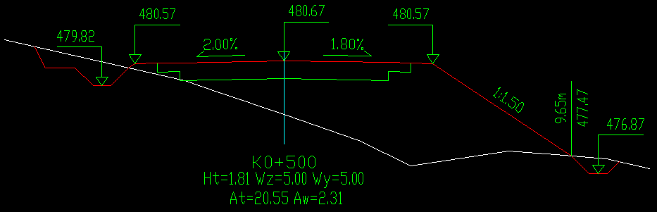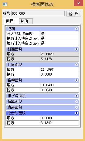 最后利用“设计”菜单下“横断面修改”命令进行土方的刷新,随后系统命令行弹出“选择横断面中心线”,选择已进行挖台阶处理的横断面中心线后,系统将弹出来“横断面修改”窗口,如图3所示,挖台阶面积“控制”选项设置完成,点击修改,横断面土方面积刷新,如图4所示。