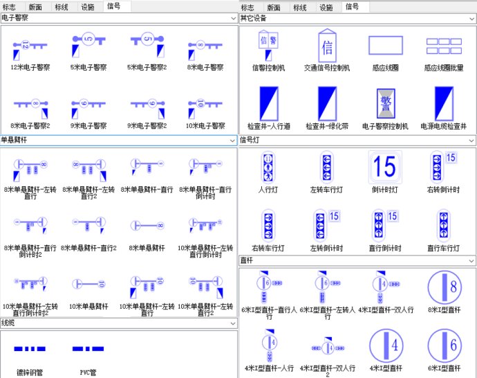 对于信号灯设计模块,系统内置了多种信号设备绘制小工具,有单悬臂杆、直杆、电子警察、各种信号灯、线缆以及信警控制机、检查井等(图1),用户可根据需求对设备库进行扩充、编组、属性修改等操作(图2)。