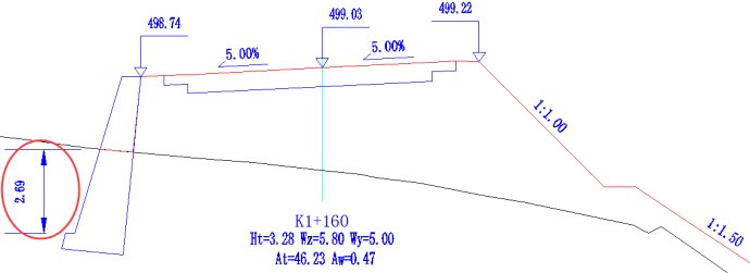 支挡构造物处理中选择需布设的路肩墙标准断面拖至挡墙设计文件,设置布设挡墙的桩号区间,保存挡墙文件,进行横断面戴帽。经过这种方式布设的路肩挡墙的埋深是根据所选墙高的挡墙实际埋入地面以下的深度自动计算的,这时挡墙标准库中的墙底埋深值是不起作用的。如下图2   K1+160断面布设的路肩墙其埋深在标准库中为1米,但实际埋深是2.69米: