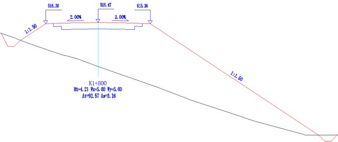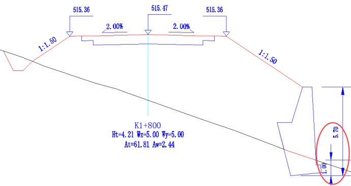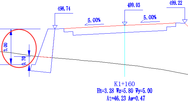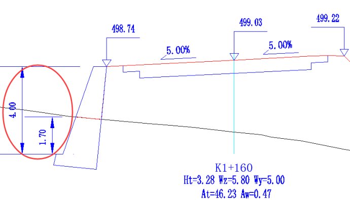 路肩墙勾选自动变换墙高之后,系统在横断面戴帽时将自动根据埋深变换墙的高度。这种情况下挡墙标准库中的墙底埋深值是最小埋深,例如上述K1+160断面采用的路肩墙标准断面埋深为1米,这个1米就是最小埋深的控制值。在横断面戴帽时,如果该路肩墙的埋深小于1米时,系统自动在挡墙标准库中提取下一个满足条件的墙高的标准挡墙(标准墙库中有足够墙高断面的条件下)。如下图4是K1+160断面采用自动变换墙高方式时系统自动提取的4米墙高的挡墙,其埋深为1.7米。