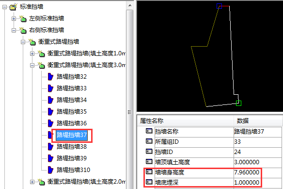 从上图中可以看到3米墙高的墙布设后其埋深为0.7米<1米最小埋深,所以在该路肩墙设置为自动变换墙高时,系统自动选择大于最小埋深1米的4米墙高尺寸的挡墙。