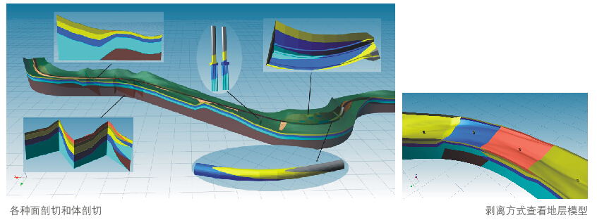 系统提供了多种模型观察方式,可对模型进行任意角度的查看,并可进行多种方式的灵活剖切(任意面、纵横剖面、折线剖面、导入模型剖切、路基模型剖切、任意断面模型剖切等),可以直观查看地质体的内部构造,并可通过层层剥离方式查看各地层的相互关系。