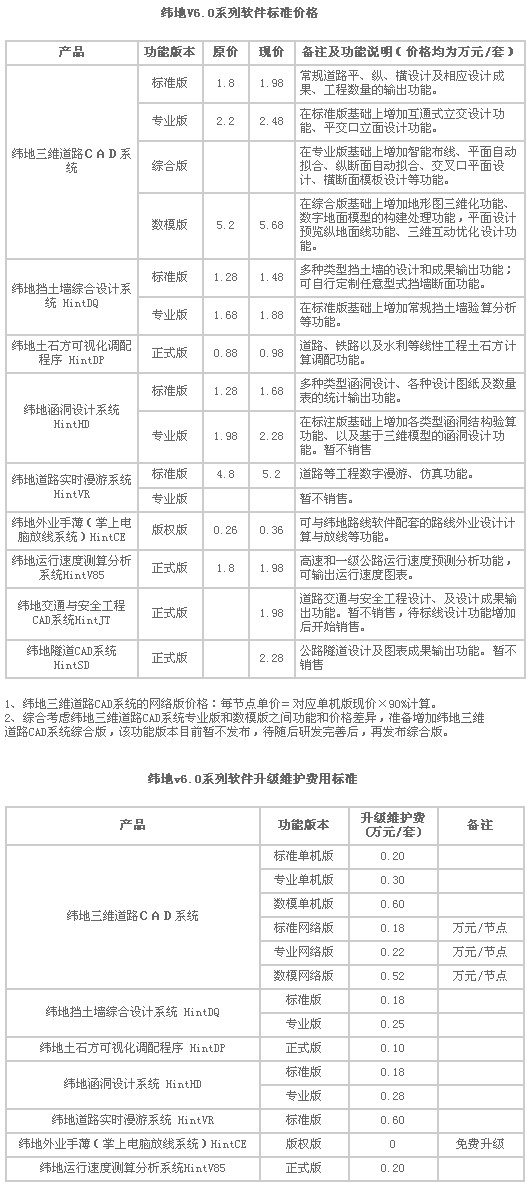 纬地v6.0系列软件标准价格及升级维护费用标准自发布之日起开始执行。