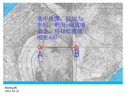 3、在cad命令窗口输入命令SCALE(放缩),选图片,指定A为基点,指定参照长度时,先选A点再选B点,提示输入新长度时,输入实际长度数值L。完成。这时用命令DIST,测量图上AB的距离,为实际长度L。至此,图片的比例就完全与实际相符合了。