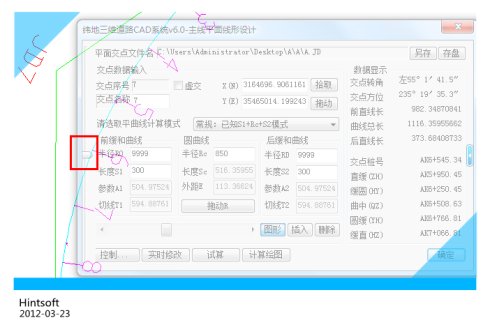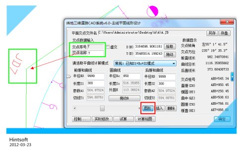 “图形”按钮可实现用户在浏览交点设计数据时平面图形与之关联显示的功能。当按下“图形”按钮,系统自动显示当前交点号的图形到当前屏幕,此时再切换交点(拖动滚动条),随着交点的切换,对应的交点图形也实时飞跃。如果没有按下“图形”按钮,切换交点数据时,则平面图形不会随之切换,以满足不同用户的使用习惯。该功能特别适用于低等级道路交点个数很多的情况,可以快速查找并显示所需交点的平面线形。PS:图形按钮具有记忆功能,当 “图形”按钮激活并保存项目后,下次打开该项目进行主线平面设计时,“图形”按钮仍保持激活状态。