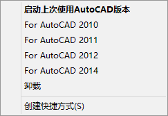 建议第一次启动纬地时,在桌面图标点击鼠标右键,在出现如下图的列表中选择“For AutoCAD20**”任一版本进行纬地软件的首次启动。