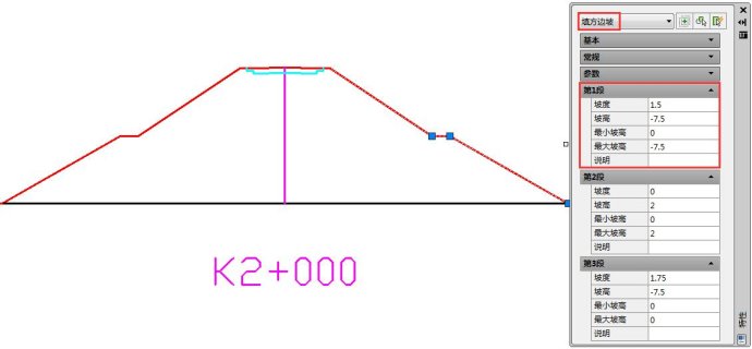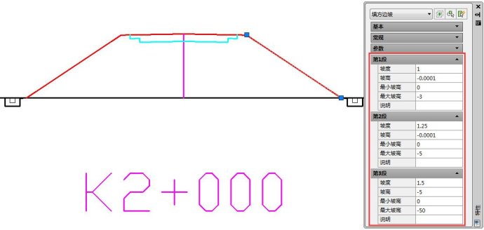 首先来了解下横断面设计模块中边坡部件各参数的含义,如下图1,K2+000标准断面右侧填方边坡,CAD特性窗口中实时显示其各段边坡参数,以第1段为例进行说明:“坡度”表示放坡的坡度;“坡高”表示边坡的高度;这里着重说明“最小坡高”和“最大坡高”的含义,系统根据该级边坡坡率试算坡高,当试算坡高小于最小坡高时,该级边坡将自动被取消,返回上级边坡;当试算坡高在最小坡高与最大坡高之间时,该级边坡坡高采用试算坡高,同时结束放坡;当试算坡高大于最大坡高时,该级边坡坡高采用参数“坡高”设置值,再进行下一级边坡试算。