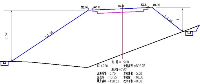 根据步骤2设置标准横断面边坡参数后,进行横断面戴帽并绘制横断面图纸。如下图3为一填方断面,左侧边坡实际坡高8.57米>5米,边坡坡度为1:1.5;右侧边坡实际坡高4米,大于3米小于5米,边坡坡度为1:1.25。依据边坡参数的设置及上述步骤2放坡的原则,系统完美解决了不同坡高设置不同坡率边坡的问题。