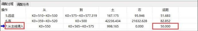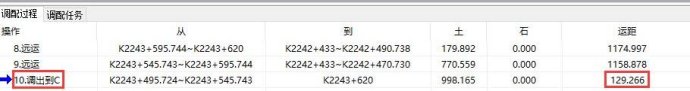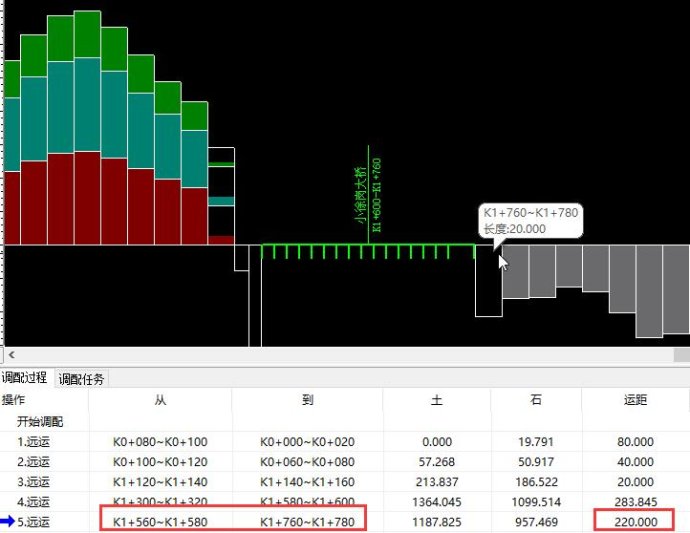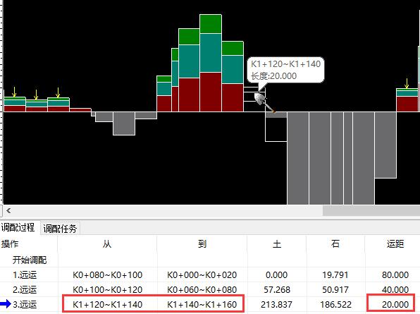 如下图1为某项目土石方纵向调配过程,将K1+120~K1+140的挖方土体调配至与其相邻的K1+140~K1+160填方段落,调配完成后,土石方调配系统主界面下方的调配过程即可显示此次调运的信息:调配桩号信息、土石数量、运距,如下图2。K1+120~K1+140的挖方土体重心为K1+130,K1+140~K1+160的填方土体重心为K1+150,所以其调配运距为20米。