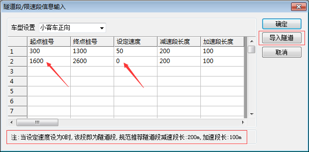 2) 当设定速度为0时,表示该段为隧道段。