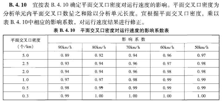 在一条道路上,每公里的平面交叉口的数量对运行速度的影响,交叉口数量越多,对运行速度的影响越大。平交口作用长度为减速段起点至加速段终点,以此范围来计算平交口的密度。