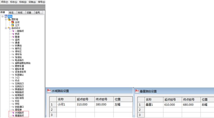 然后在护栏自动布设时,在护栏设置规则中,对水域和悬崖路段的护栏规则进行自定义,如:“水域:Grd-A-4E”。最后系统在自动布设护栏时,就可以自动识别水域和悬崖路段的护栏。