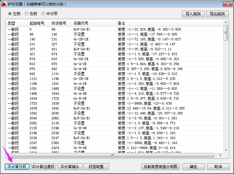 点击“②计算过渡段”,在弹出的对话框中对护栏过渡段的设置规则进行定制修改。