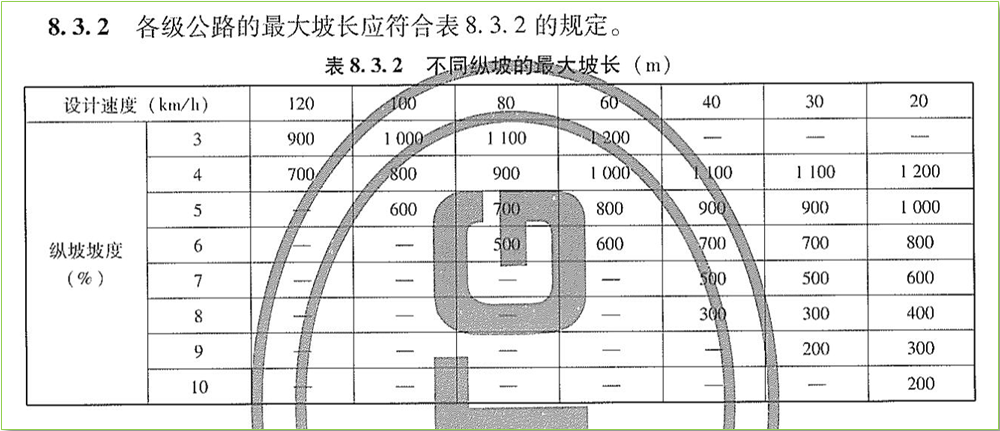 前面你提到了“3%不限制坡长”的问题。是的,在《规范》表8.3.2中,对于设计速度40km/h以下的公路,当采用3%及以下的纵坡时,是不再限制坡长了。也就说3%(及以下的纵坡)可以一直拉到10km或者20km了。这仍然是由车辆性能条件和公路纵坡设计原理决定的。根据试验研究,载重汽车(比功率在8.3kW/t)满负荷行驶时,可以在3%连续性上坡中始终保持40km/h以上的行驶速度。既然,连续上坡的速度都能达到公路设计的条件和要求了,也自然就不用限制坡长了。