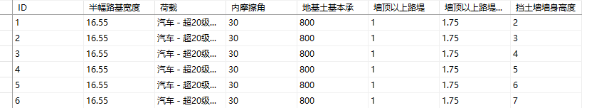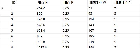 其中ID为该类每一尺寸唯一索引,不能重复,必须与<挡墙名称>_G<挡墙名称>_P表中一一对应。