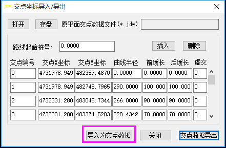 执行命令: JDZB_IN,在交点坐标导入/导出界面,点击“导为交点数据”即可。